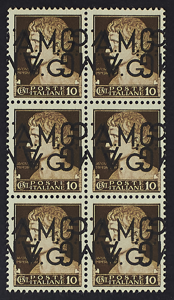 10 C. SETTE ESEMPLARI CON DOPPIA SOPRASTAMPA DI CUI UNA CAPOVOLTA