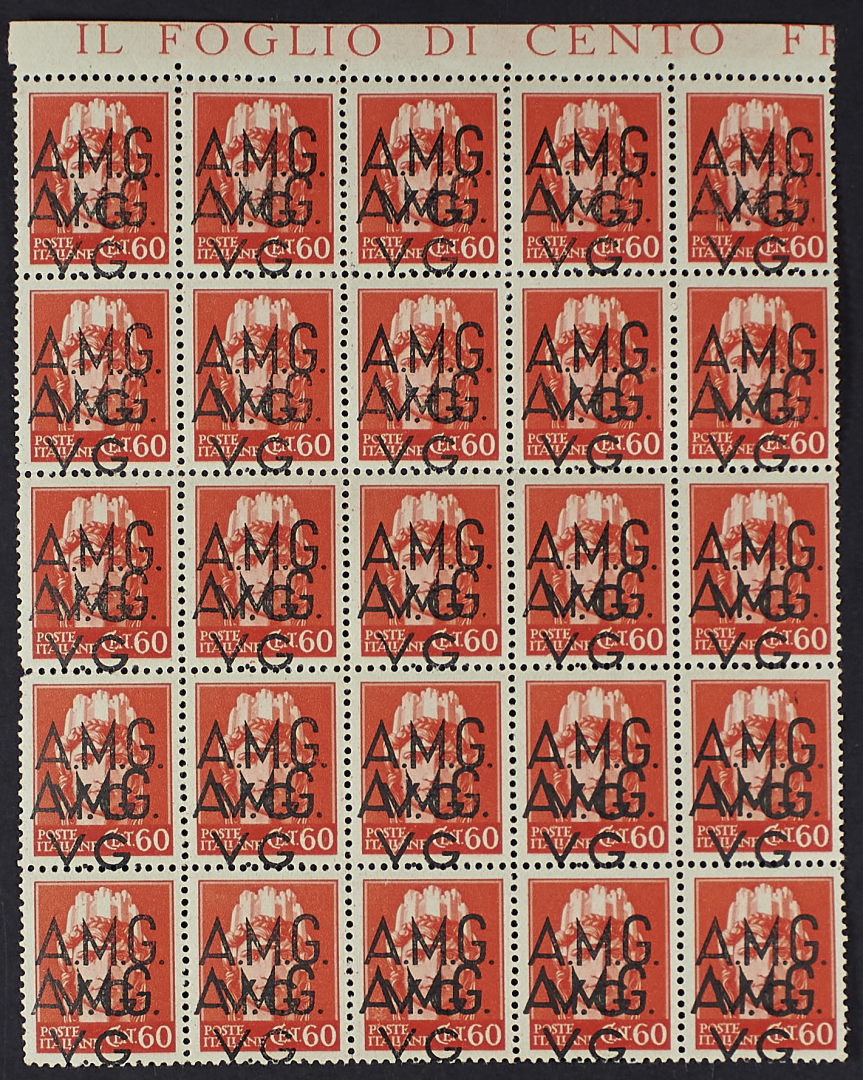 1945 - 60 c. blocco di venticinque esemplari doppia soprastampa bordo di foglio superiore