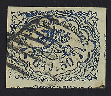 1864 - 50 baj. azzurro oltremare scuro stampa difettosa - Ottimi margini - Timbro Fulpius - Firme Giulio Bolaffi e A.D.