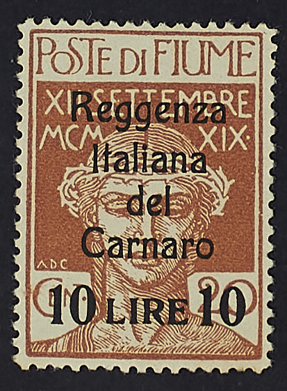 1920 - Reggenza Italiana del Carnaro - Nuova tiratura 10 L. / 20 c. senza emblema al verso