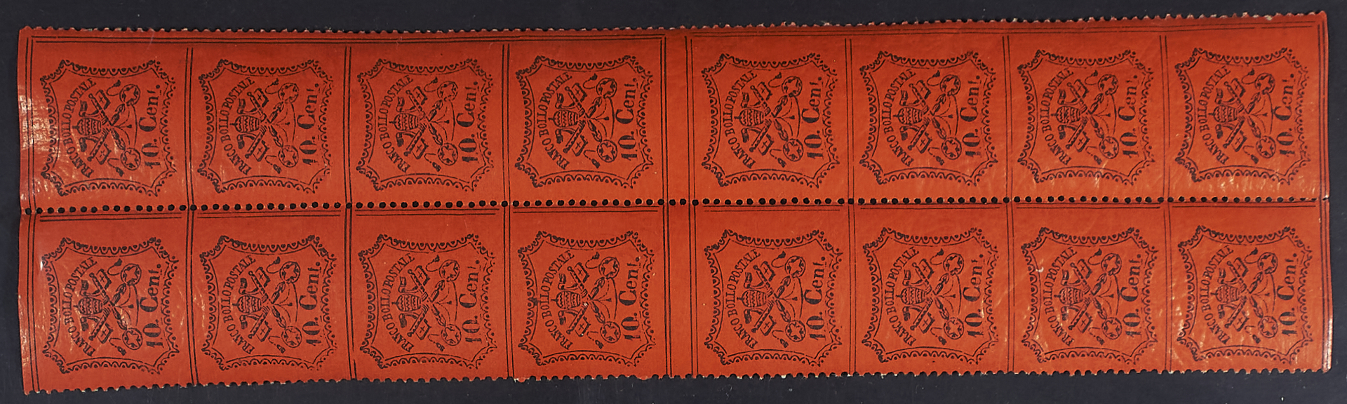 1868 - 10 c. arancio vermiglio blocco verticale di sedici esemplari non dentellati orizzontalmente - Non comune