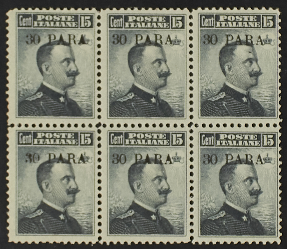 1908 - Seconda emissione locale 20 pa. /10 c. e 30 pa. /15 c. entrambi in blocchi orizzontali di sei esemplari - Uniti 1 pi. / 25 c. due esemplari di cui uno con errore "PIASTRE"