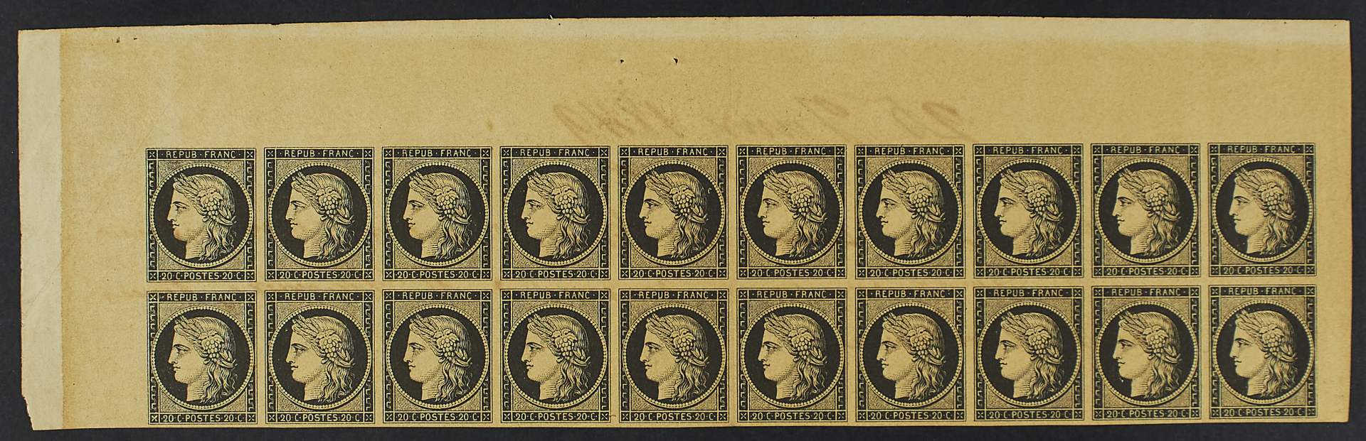1849 - Prima emissione 20 c. nero su carta gialla blocco orizzontale di venti esemplari (parte superiore del foglio con i margini completi) - Al verso annotazione manoscritta del 25 gennaio 1849 indicante l'appartenenza del documento alla prima consegna effettuata dallo stampatore Lacroix - Minimi difetti da esaminare ma pezzo unico e spettacolare - Timbro Calves - Cert. Behr