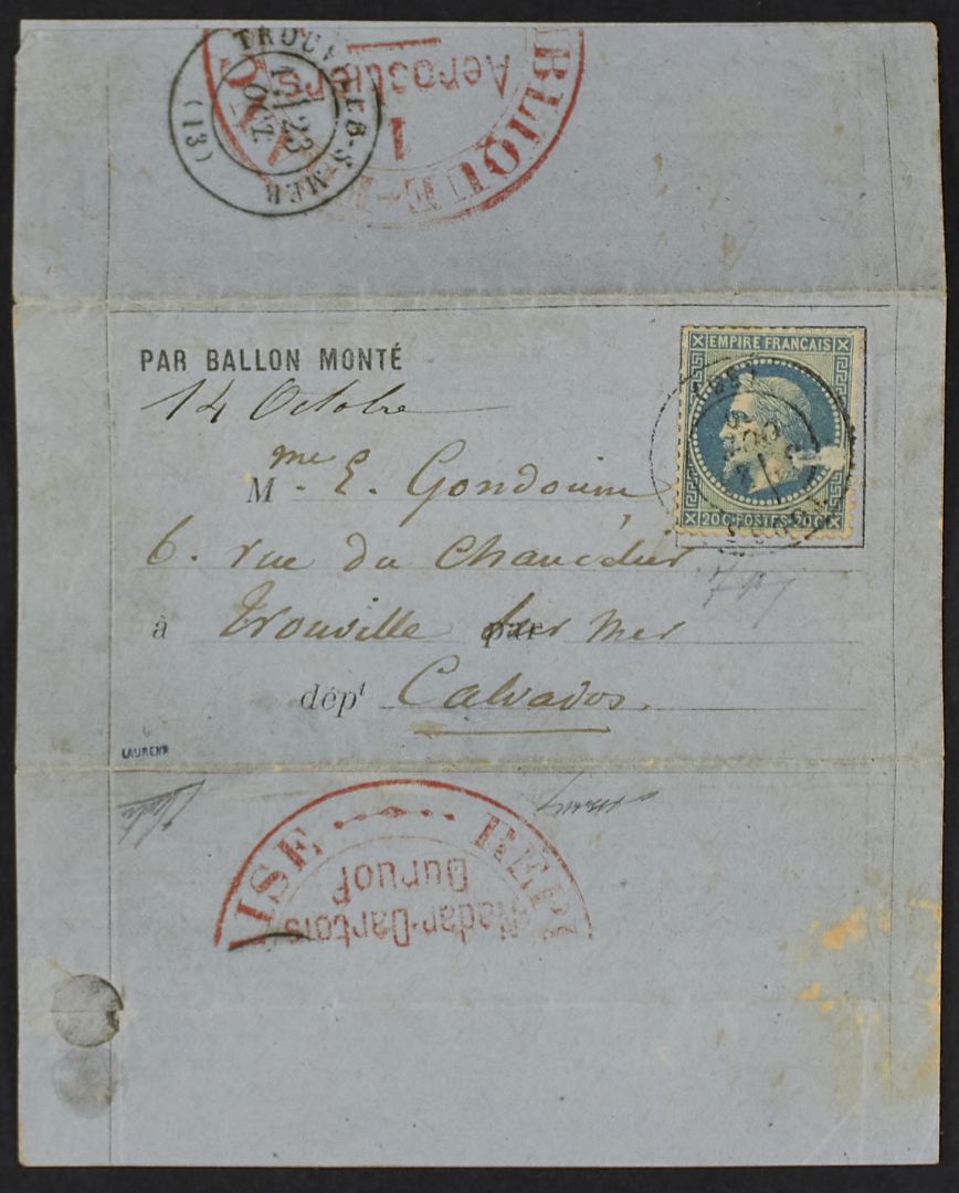 1870 - Ballon Monté "Le Victor Hugo" del 14 ottobre per Trouville sur Mer affrancato con 20 c. con il bollo "Aérostiers" in rosso al verso - Molto raro - Cert. Calves - Firma A.G. Bolaffi
