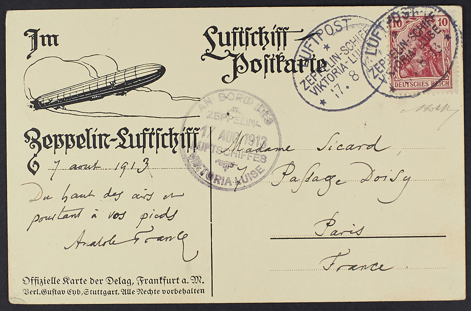 1913 - Zeppelin - Cartolina postale del 17 agosto del dirigibile "Viktoria - Louise" per Parigi con testo autografo dello scrittore Anatole France