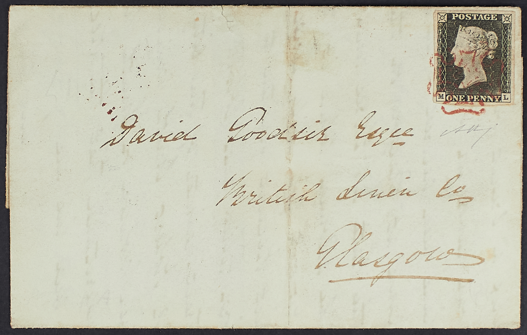 1840 - Prima emissione 1 p. nero su lettera del 30 maggio (primo mese d'uso) da Edimburgo per Glasgow - Cert. Bolaffi