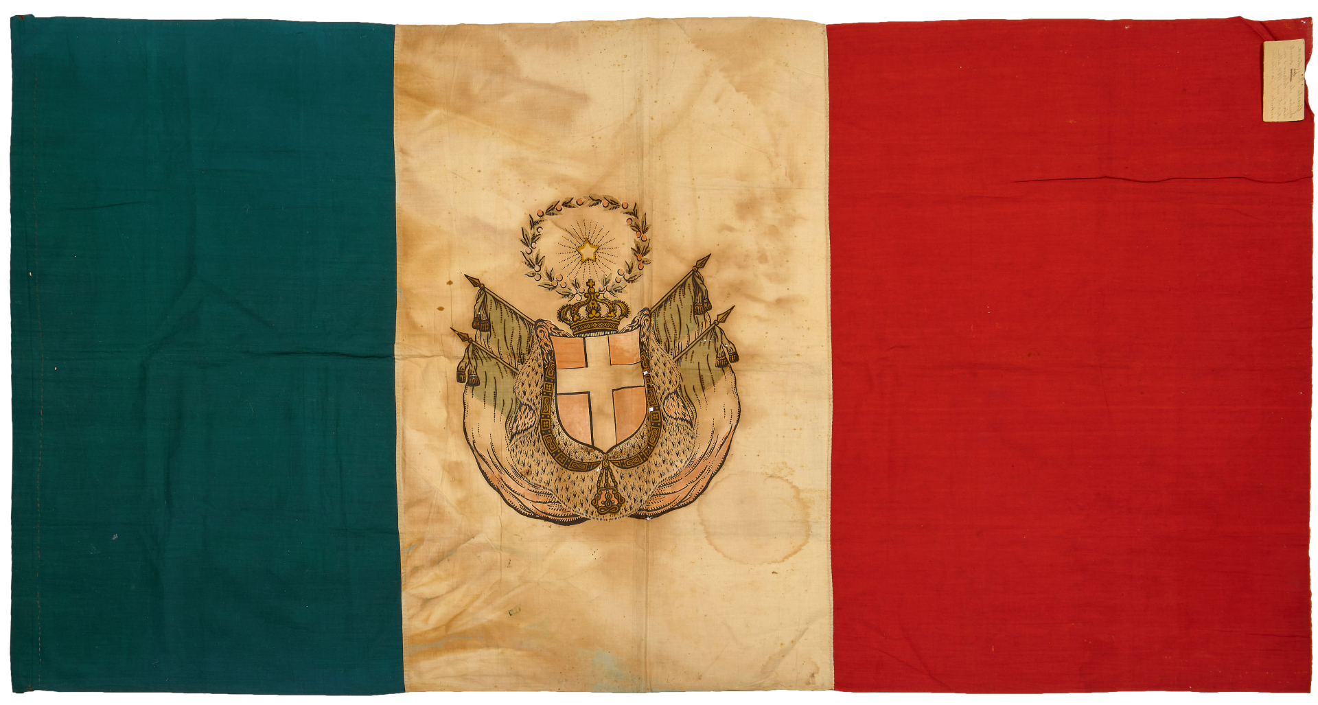cotton. A handwritten note, presumably contemporary, is affixed to the top edge, bearing the following inscription: “This flag appears to have flown either in Salerno or Naples, in 1860, at Garibaldi's entry.”