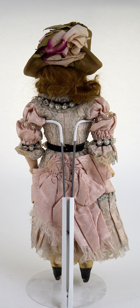 glass eyes, cloth body with composition forearms and legs covered in wax, molded boots, original dress, hat sewn from antique fabrics.
