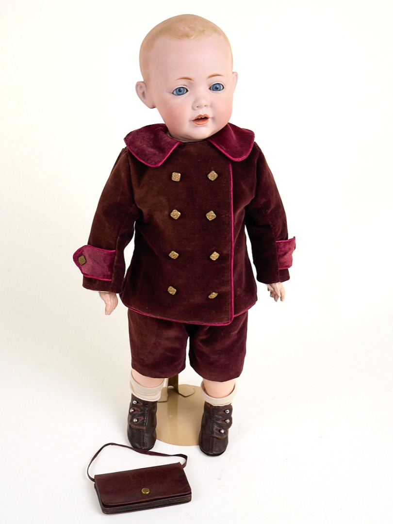 porcelain with rare solid-head variant, Toddler body. Beautiful clothes sewn from antique fabrics.