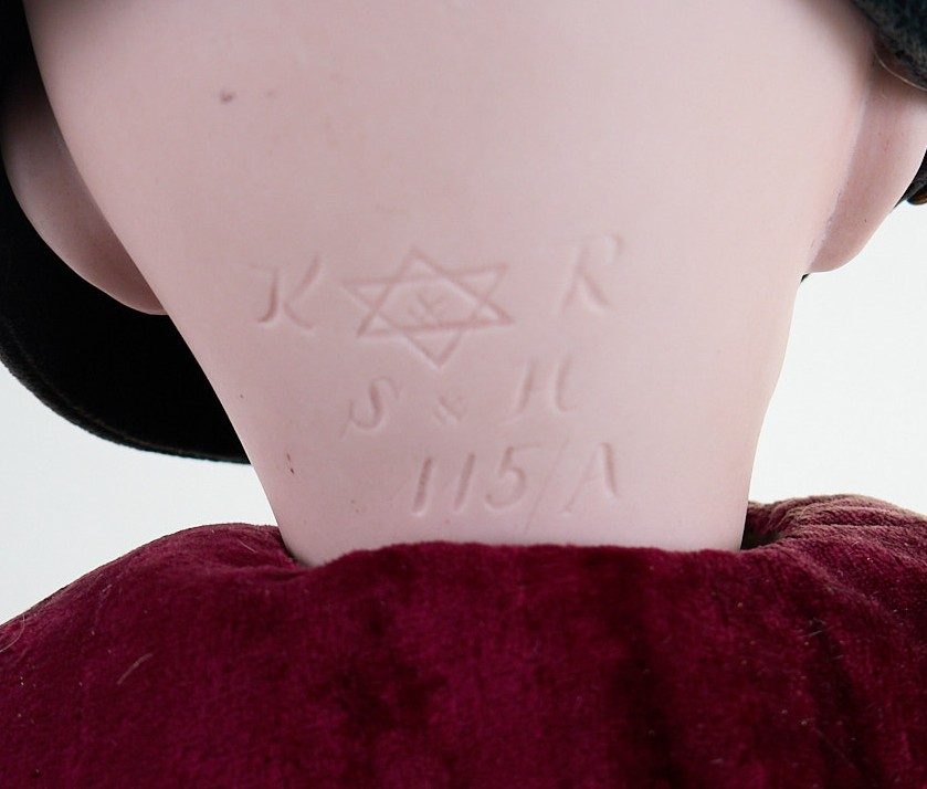 marked "K [star] R 115A", porcelain head, toddler composition body. Beautiful clothes sewn from antique fabrics.