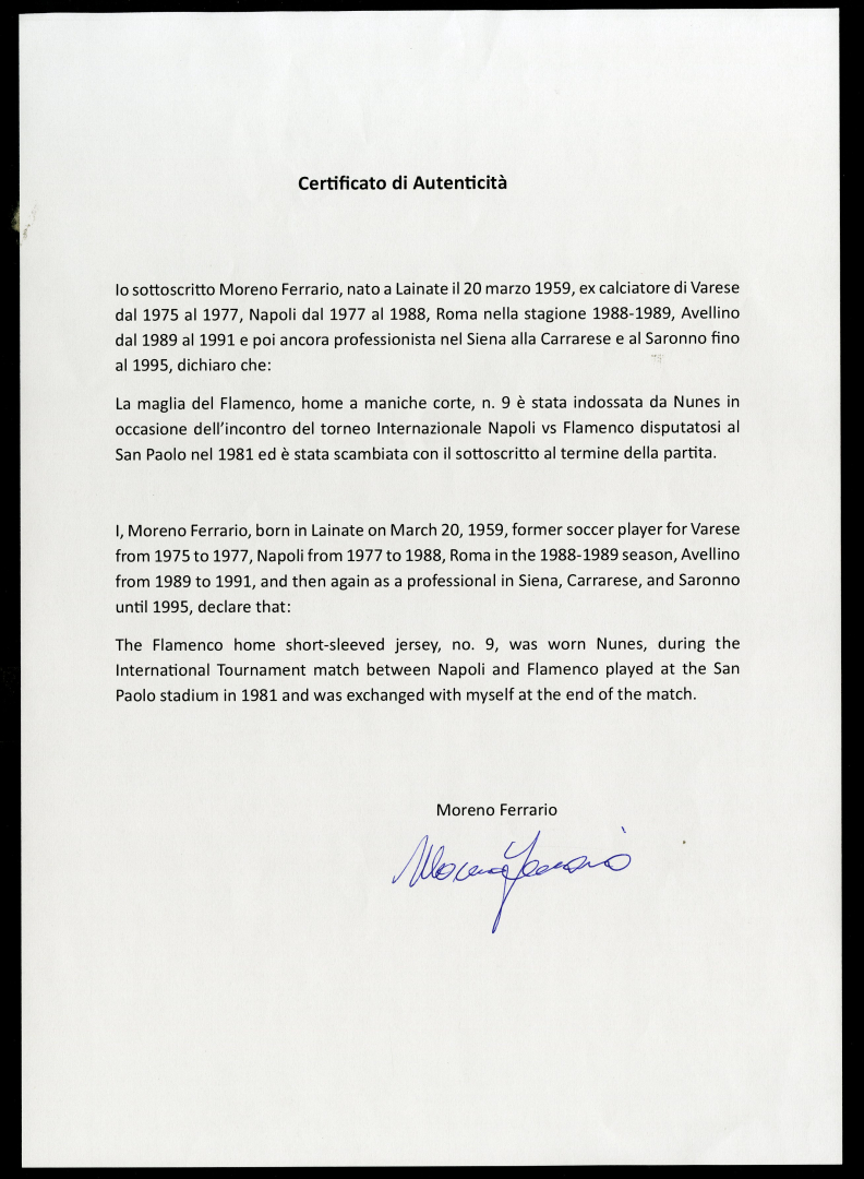 Jersey worn by Nunes during the Torneio Internacional in Naples, Napoli vs Flamengo (0-5) on 14 June 1981, played at the San Paolo stadium and swapped at the end of the match with his opponent Moreno Ferrario.