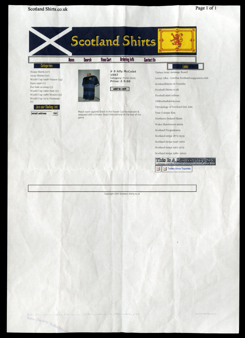 Jersey attributed to the Rous Cup match between Scotland and Brazil (0-2) on 26 May 1987, played
