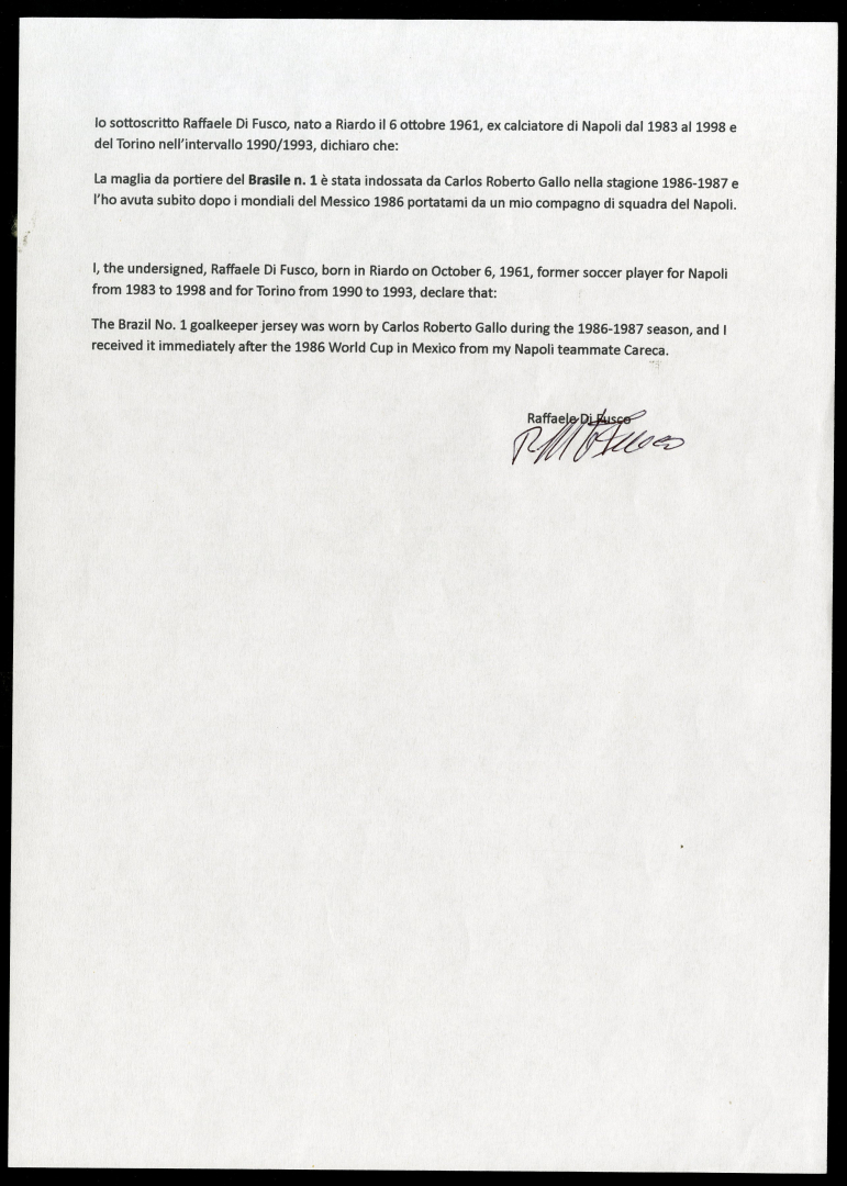 Jersey worn by Carlos during the 1986-1987 season and donated to Rafaele Di Fusco.