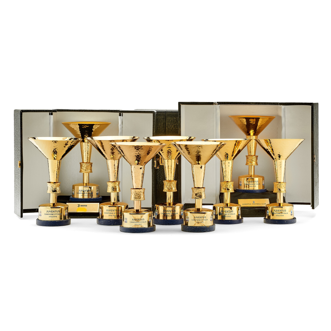 Original scaled-down replicas of the “Juventus Campione d’Italia” trophy, presented to players, executives, and members of the team staff, complete with original packaging.