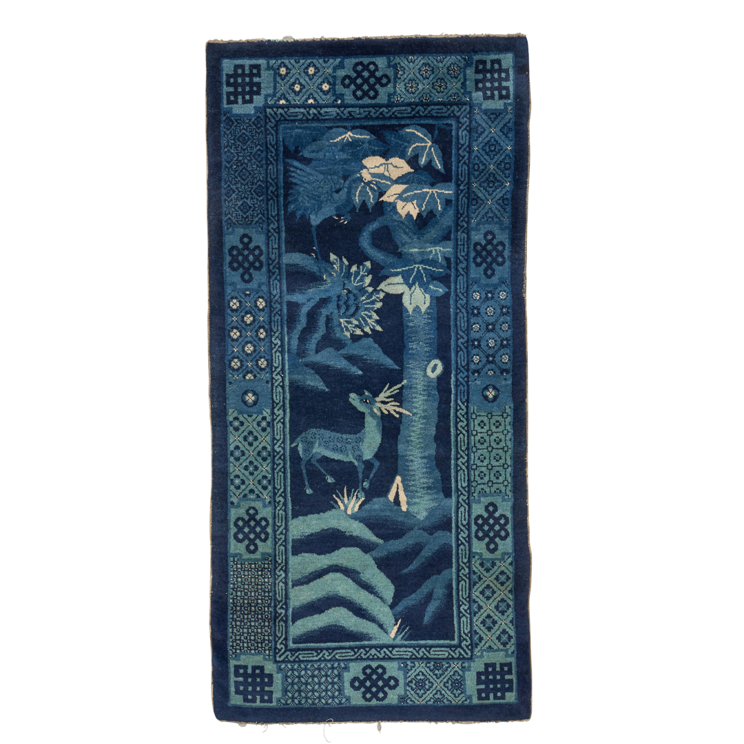 The motif of the deer and the Manchurian crane, with its typical red crest, is a 'classic' in Baotou production (L. Larsson jr, Carpets from China Xinjiang & Tibet, London 1988, p. 71, fig. 72 for a similar example dated to the end of the 19th century).
