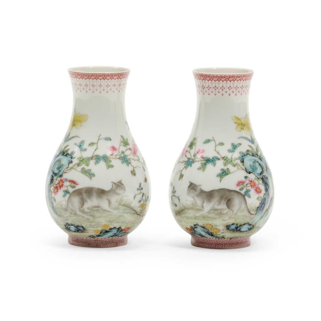 Fine porcelain painted with polychrome enamels with a decoration of a cat amidst flowers, rocks and an inscription with seals, apocryphal Qianlong mark to the centre of the base.