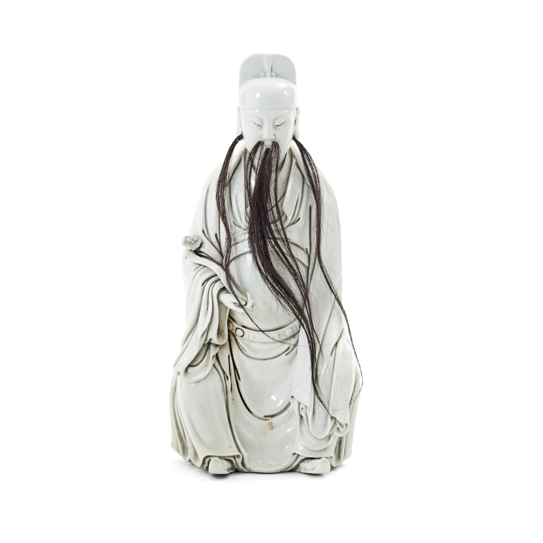 Dehua porcelain ('blanc de chine') and hair, the deity depicted seated, in his right hand a ruyi sceptre.