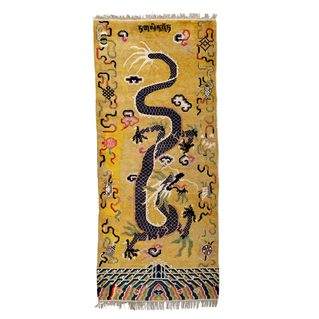 Yellow ground with polychrome decoration of a dragon flying amidst clouds and darts, stylised sea waves and mountain peaks at the bottom, the border with auspicious objects, inscription in Tibetan at the top.