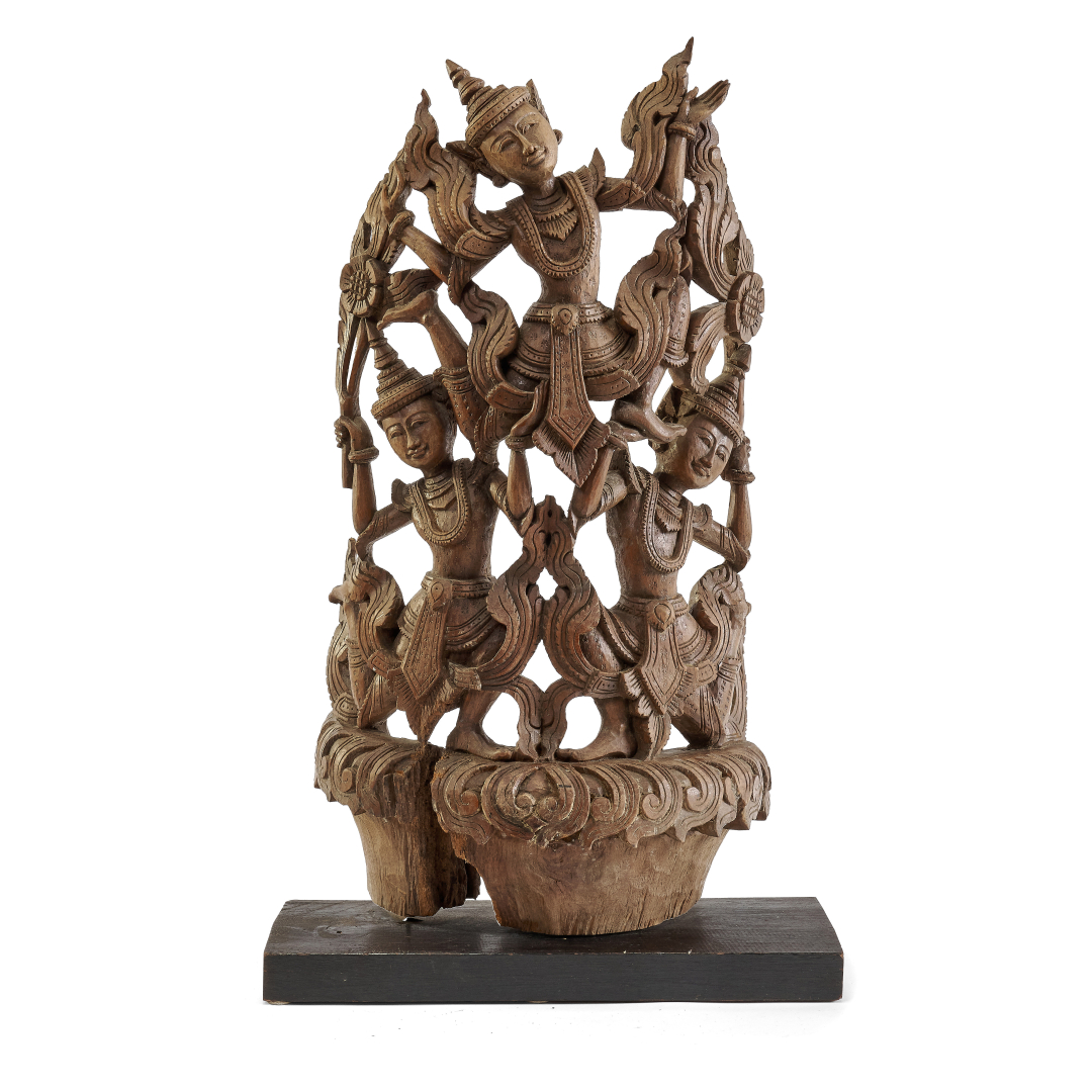 Carved wood, the two figures depicted in dynamic poses amidst fluttering strips of fabric.