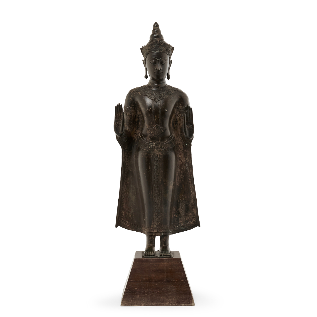 Bronze on a wooden pedestal, the standing deity with both arms bent at the elbow and hands with open palms in a gesture of reassurance, wearing a loose robe with ornaments in relief, the face surmounted by a crown, wood pedestal.