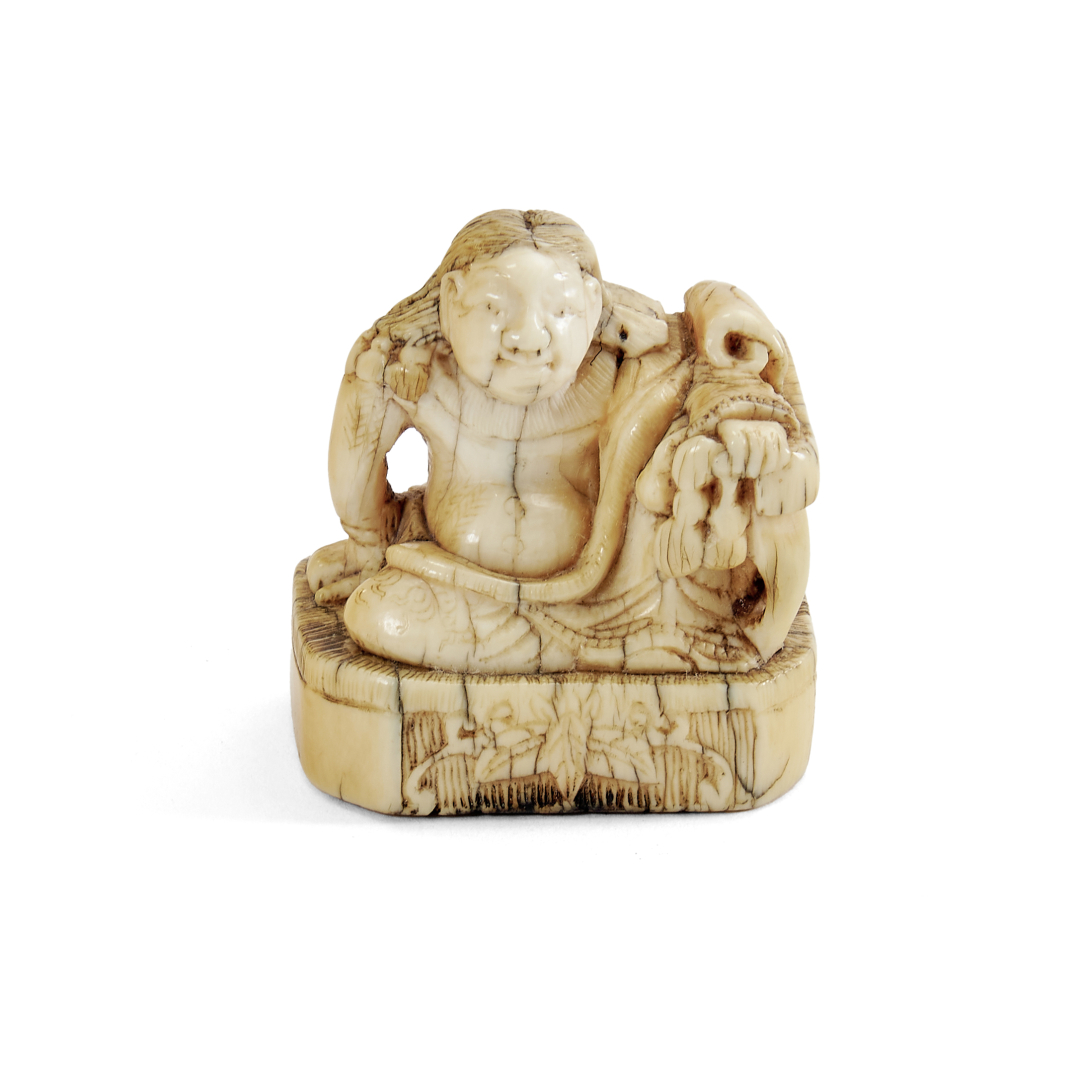Ivory, depictING a seated South Sea Islander, his left arm resting on a low table under which a child is hiding.