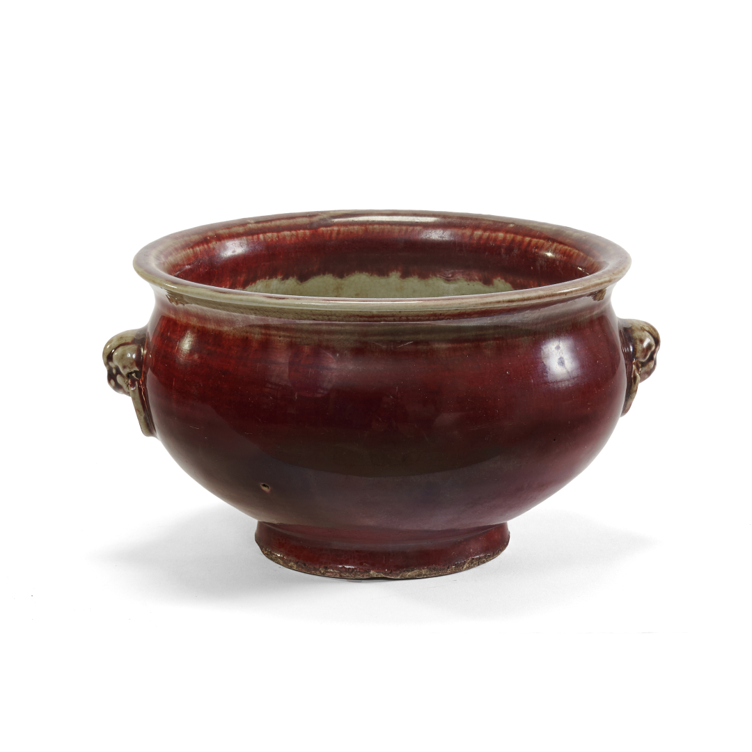 Porcelain covered with red 'sang de boeuf' glaze, handles modelled as lion's heads with a ring between the jaws, apocryphal Yongzheng mark to the centre of the base.