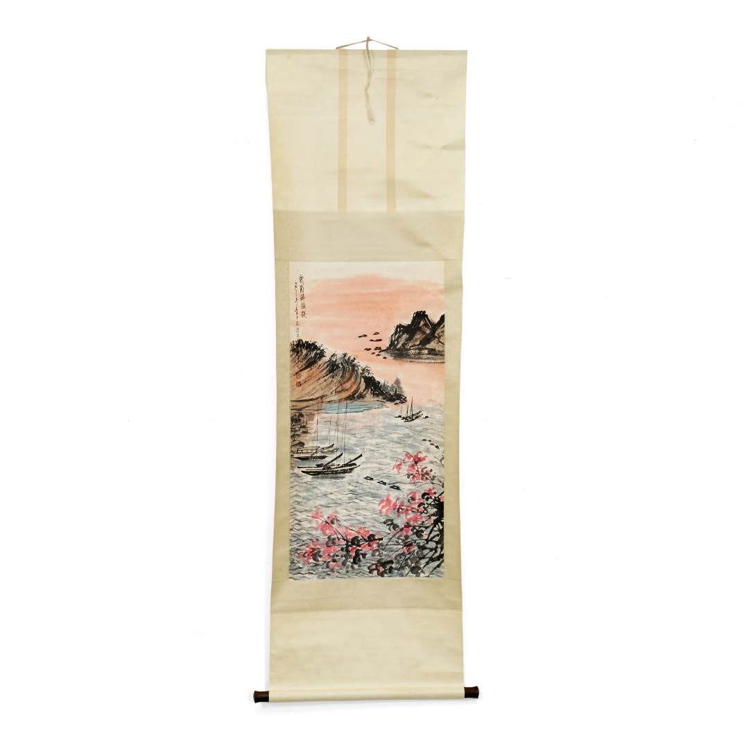Ink and colors on paper, vertical hanging scroll, a lake landscape with rocks, trees and boats, inscription with seals at the top left, in the style of Fu Baoshi.