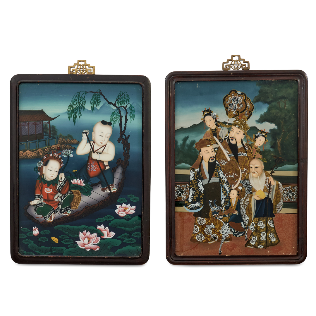 Reverse painted glass, each with wooden frame and metal fittings, one depicting the three Fulushou deities with a lady in a garden, the other with two children in a boat in a lotus pond.