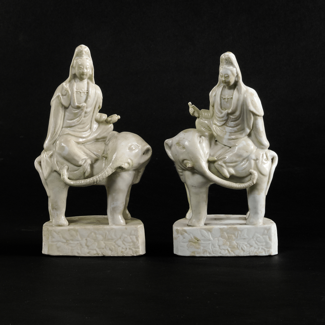 Dehua porcelain ('blanc de chine'), the two bodhisattvas of benevolence (Samantabhadra in Sanskrit) seated on the back of an elephant, which in turn is supported by a semicircular plinth decorated on the front with a relief floral motif.