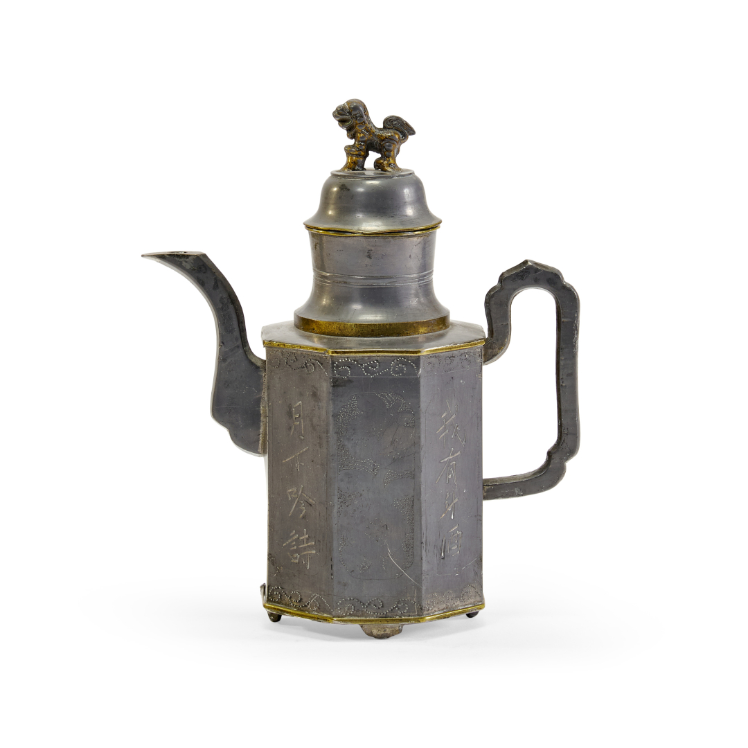 Pewter, octagonal section, modelled handle and spout, the lid with Buddhist lion finial, incised characters on the body.