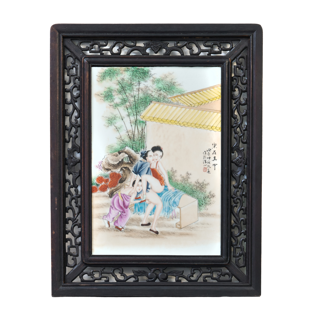 Porcelain painted with polychrome enamels, erotic scene inspired by a painting by Qiu Ying (1494-1552), set in a garden, inscription and signature with seal on the right margin, carved wooden frame.