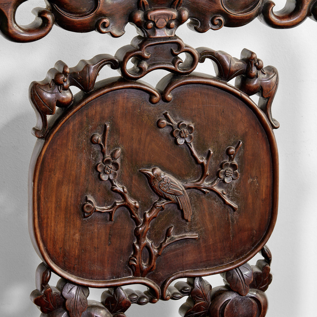 Hard wood, the backrest with a carving of flowers, birds and bats.