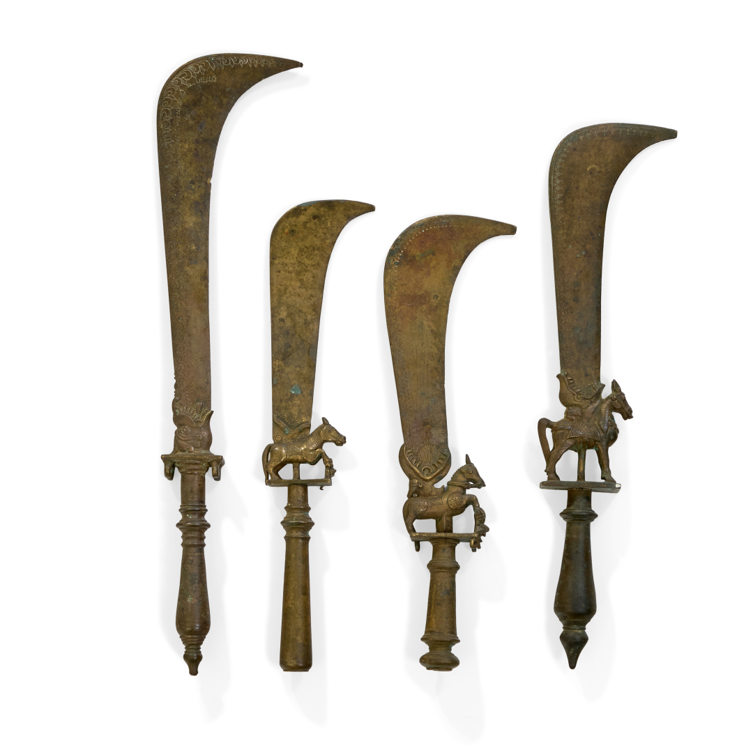 Metal, curved blade, each with a full-relief horse figure near the hilt.