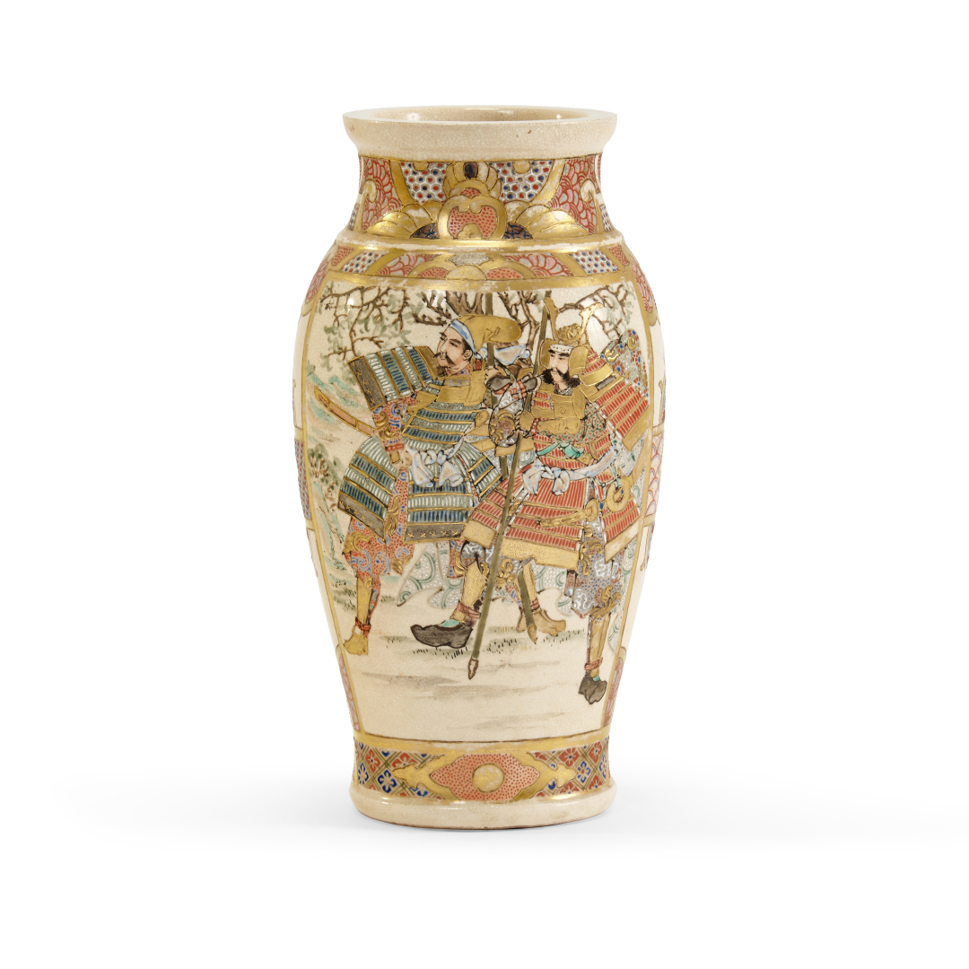 Satsuma-type ceramic painted with polychrome enamels and gold, the body with two large reserves with figures in the landscape.