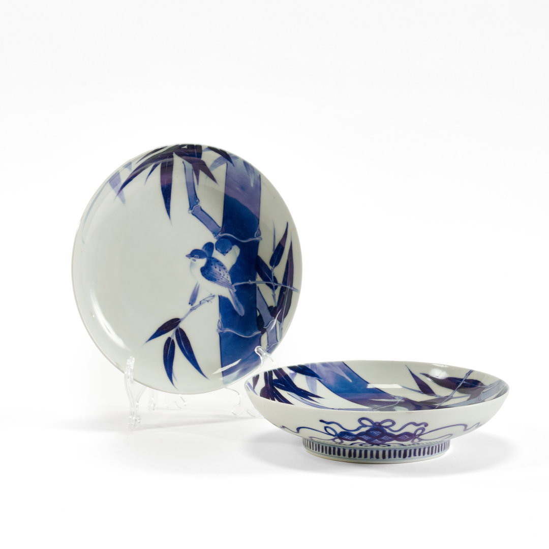 Nabeshima-type porcelain with cobalt blue underglaze decoration of birds and bamboo.