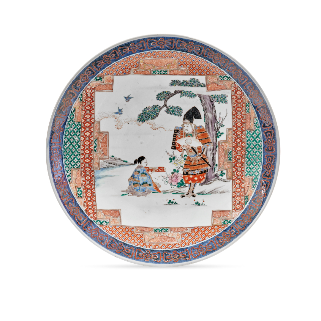 Porcelain painted with polychrome enamels, decorated with a scene with a samurai and a young attendant in the landscape within a polygonal cartouche reserved on a geometric ground.