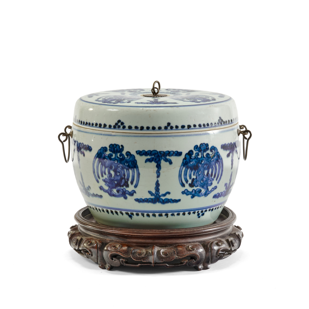 'Blue and white' porcelain, decoration of stylised phoenixes, metal handles and ring on the lid's top, wooden base.