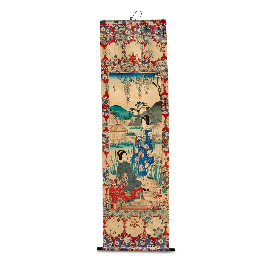 Print on crepon paper (chirimengami-e), the composition depicting two ladies in a landscape with huts, signature and seal at the bottom left, within a border with stylised flowers.