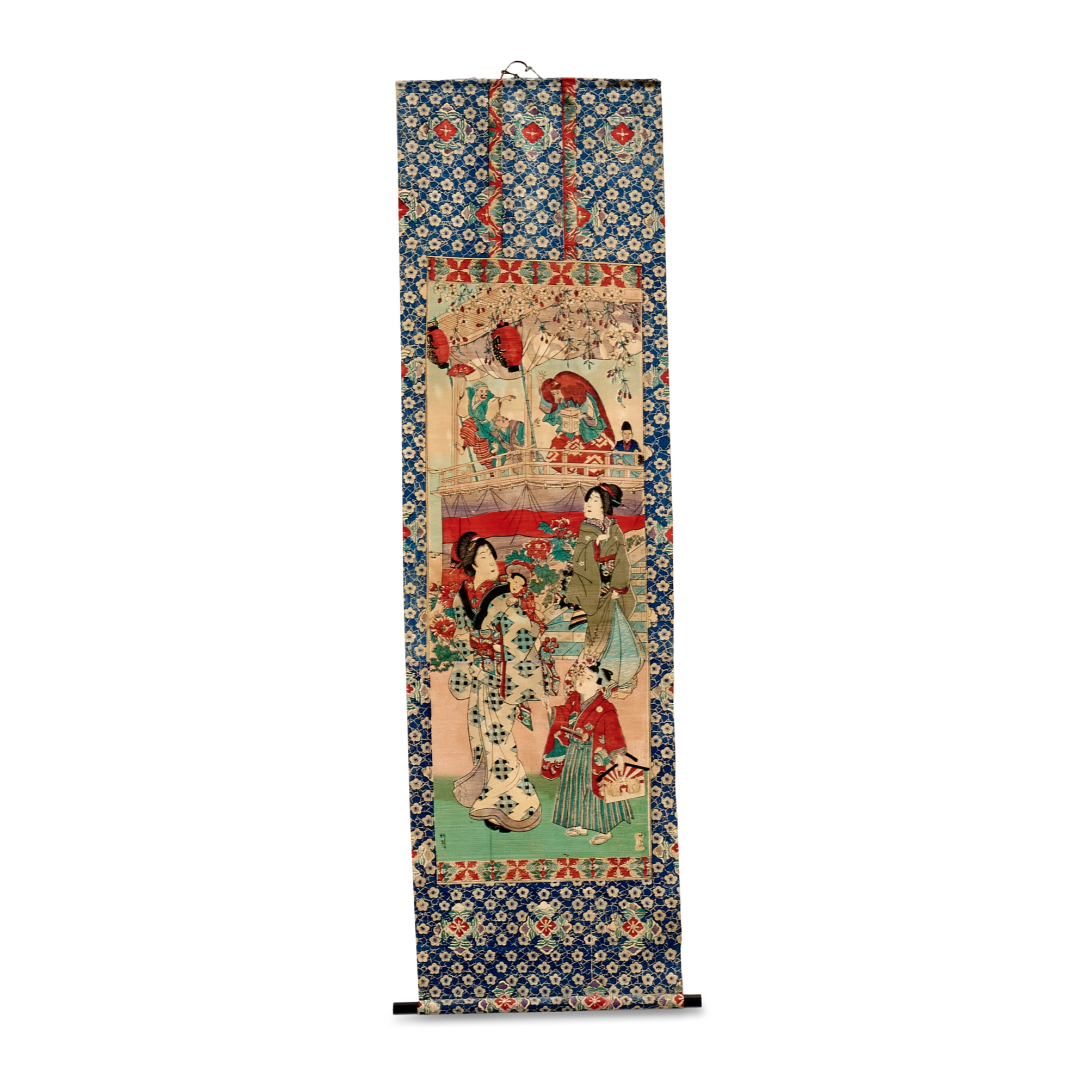 Print on crepon paper (chirimengami-e), the composition depicting two ladies and two children attending a theatre performance, signature at the bottom left, within a border with cherry blossoms.