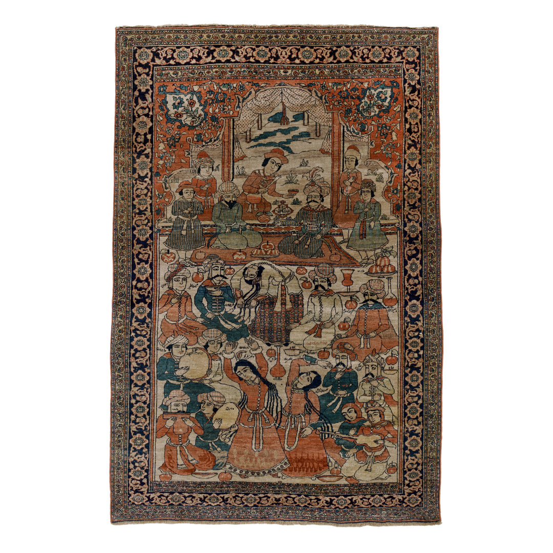 Decorated in polychromy with a banquet scene, the top with the notables accompanied by pages attending a dance show, with female figures and musicians, several inscriptions.