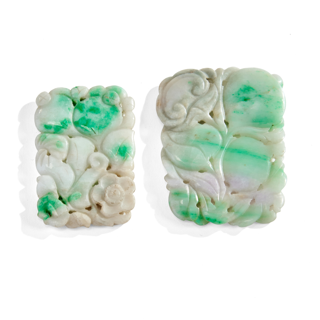 Green and white jadeite, both finely carved with leafy branch with peaches.