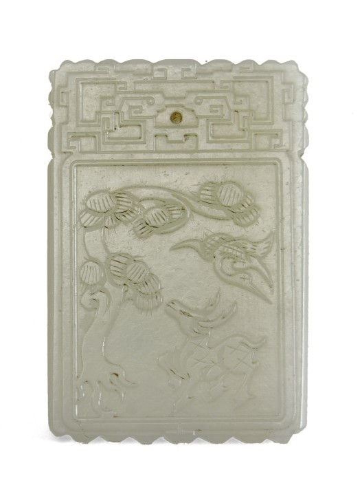 Jade, relief decoration, one side with deer, crane and tree, the other with inscription.