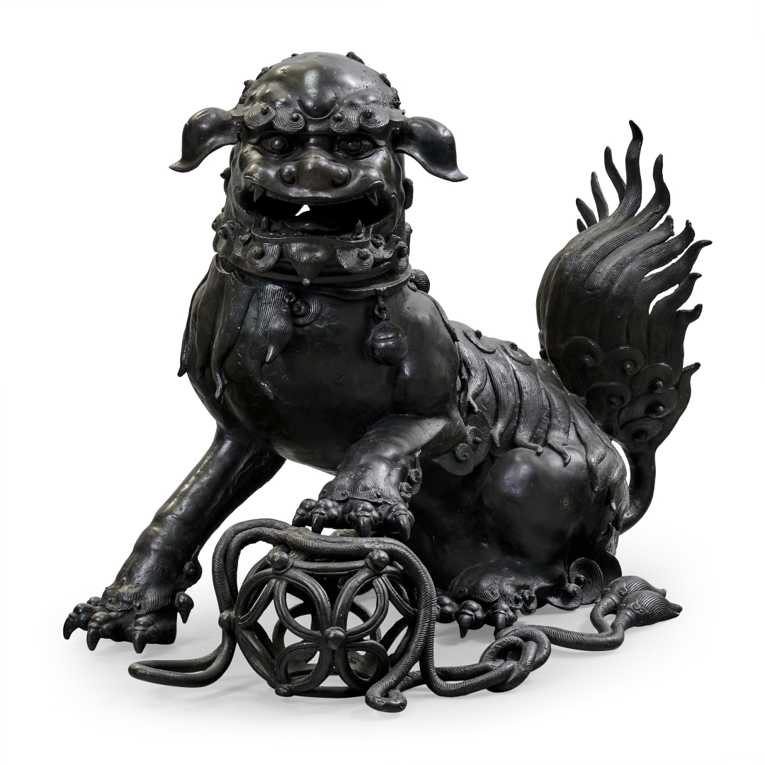 Bronze, modeled as a Buddhist lion, sitting on its hind legs, the left front paw resting on the Ball enriched with laces, some rattles around the neck, the head movable, the open mouth gives an expression of divine dignity.
