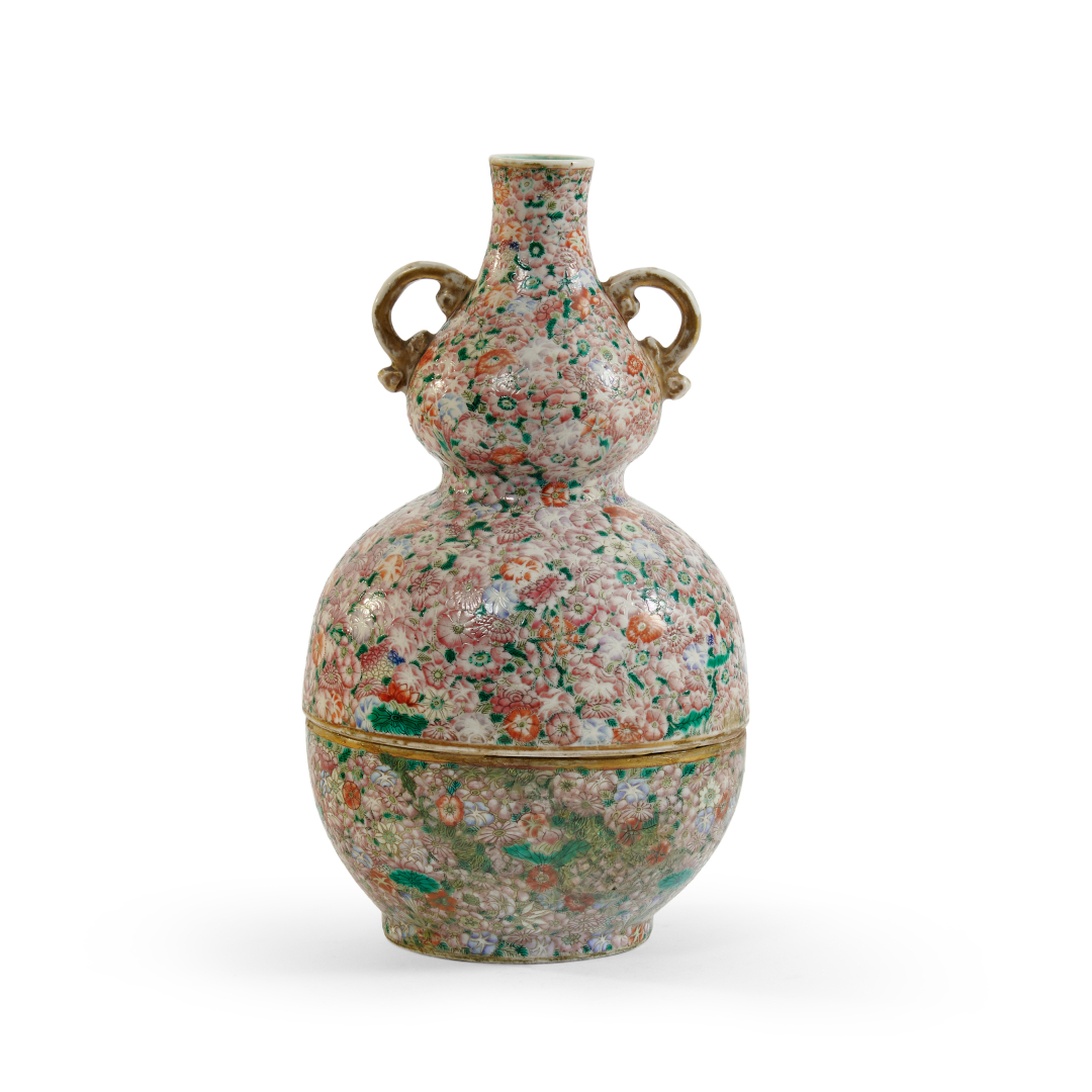 Porcelain painted with polychrome enamels, the object consisting of a bowl on which a bottle-shaped vase with semicircular handles is glued, decorated with an exuberant 'millefleurs' decoration.