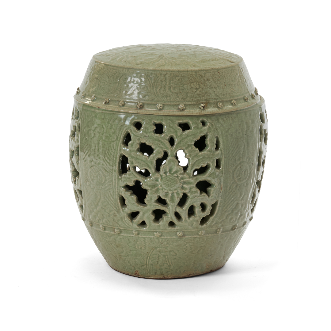 Longquan ceramic with celadon glaze, barrel-shaped, four openwork panels with flowers and racemes reserved on a ground of floral and geometric motifs, the upper side with a floral decoration in relief, two horizontal bands of small relief corollas.​​​