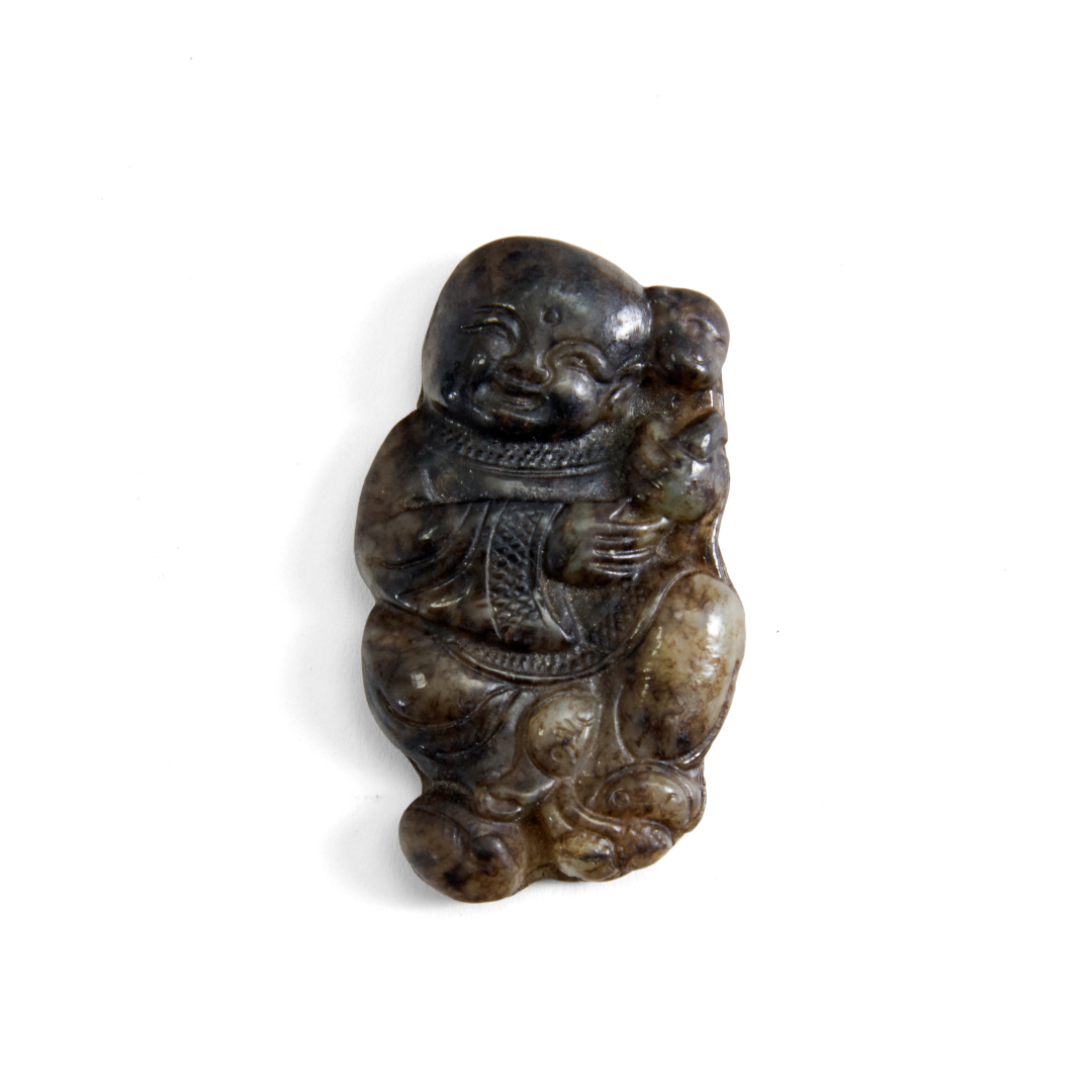 Brown jade, depicting a standing child, the other side with lotus leaf.