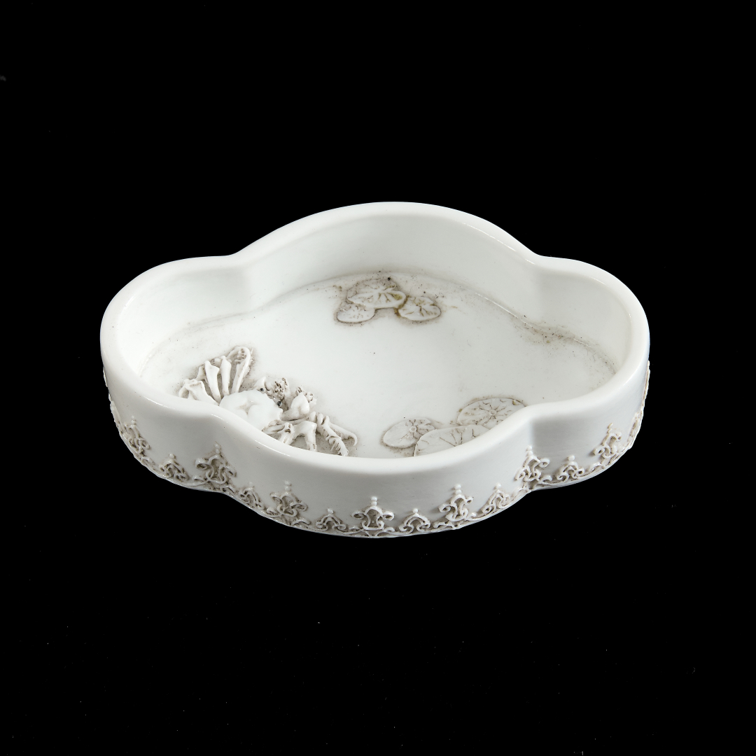Porcelain, quadrilobate section, the outside of the wall with an arabesque in relief, the inside with a crab and leaves in accentuated relief, impressed apocryphal Guangxu mark to the center of the base.