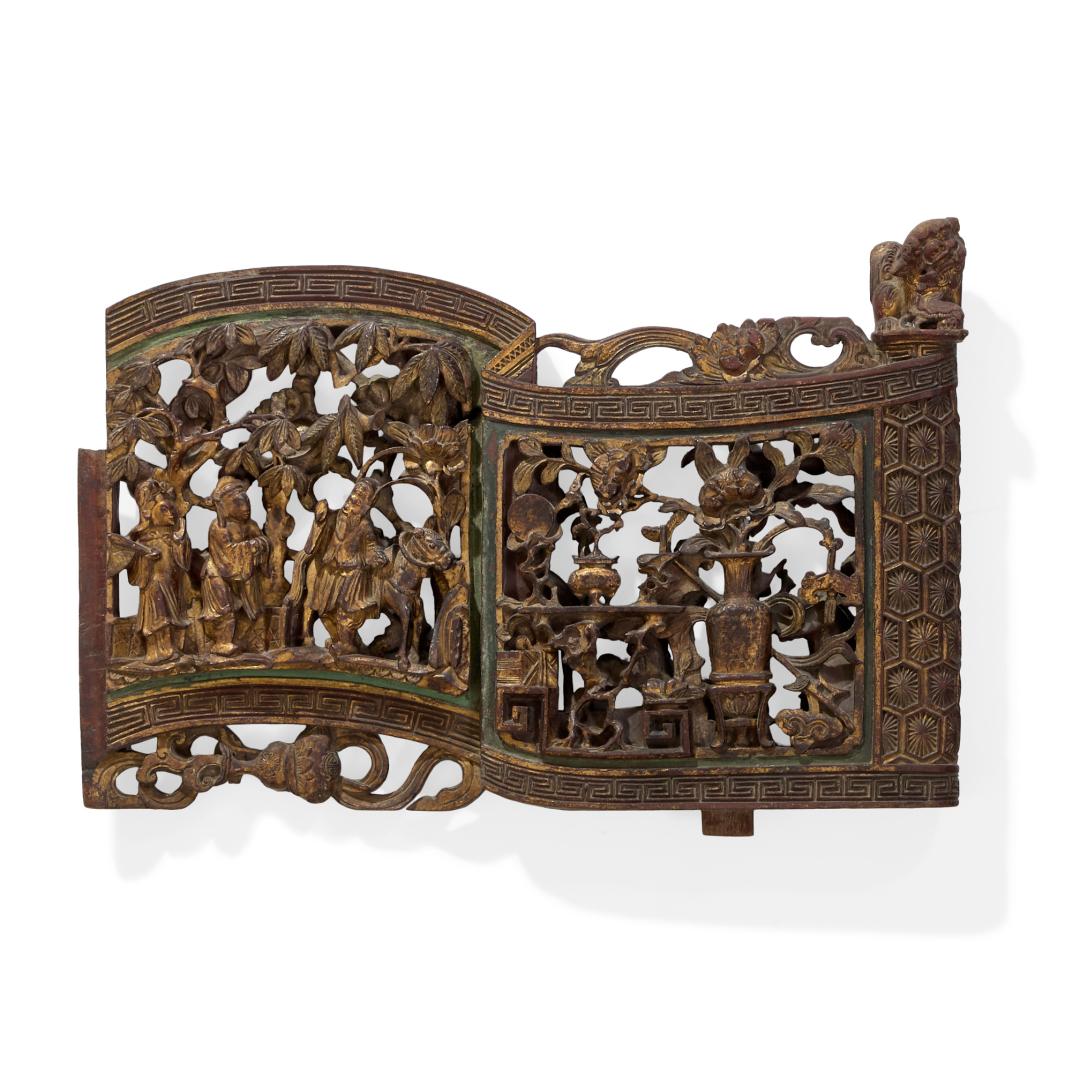 Carved, painted, and gilded wood, wavy shape, openwork decoration, figures in a landscape on the left, a composition with flowers and objects on the right, the two scenes enclosed by a geometric relief border, a Buddhist lion at top right.
