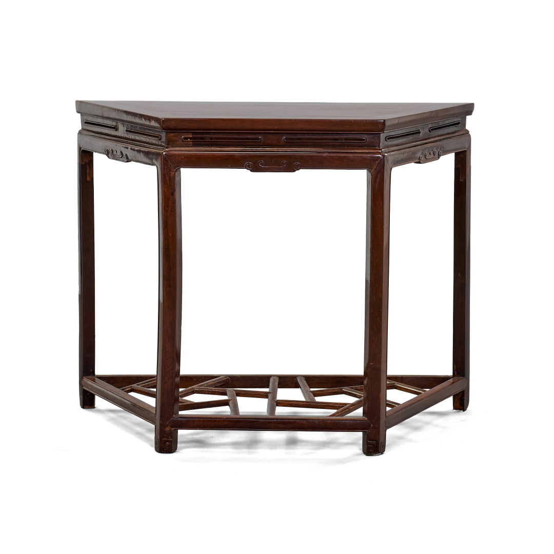 Carved wood, trapezoidal section, the lower section with 'cracked ice' geometric motif.
