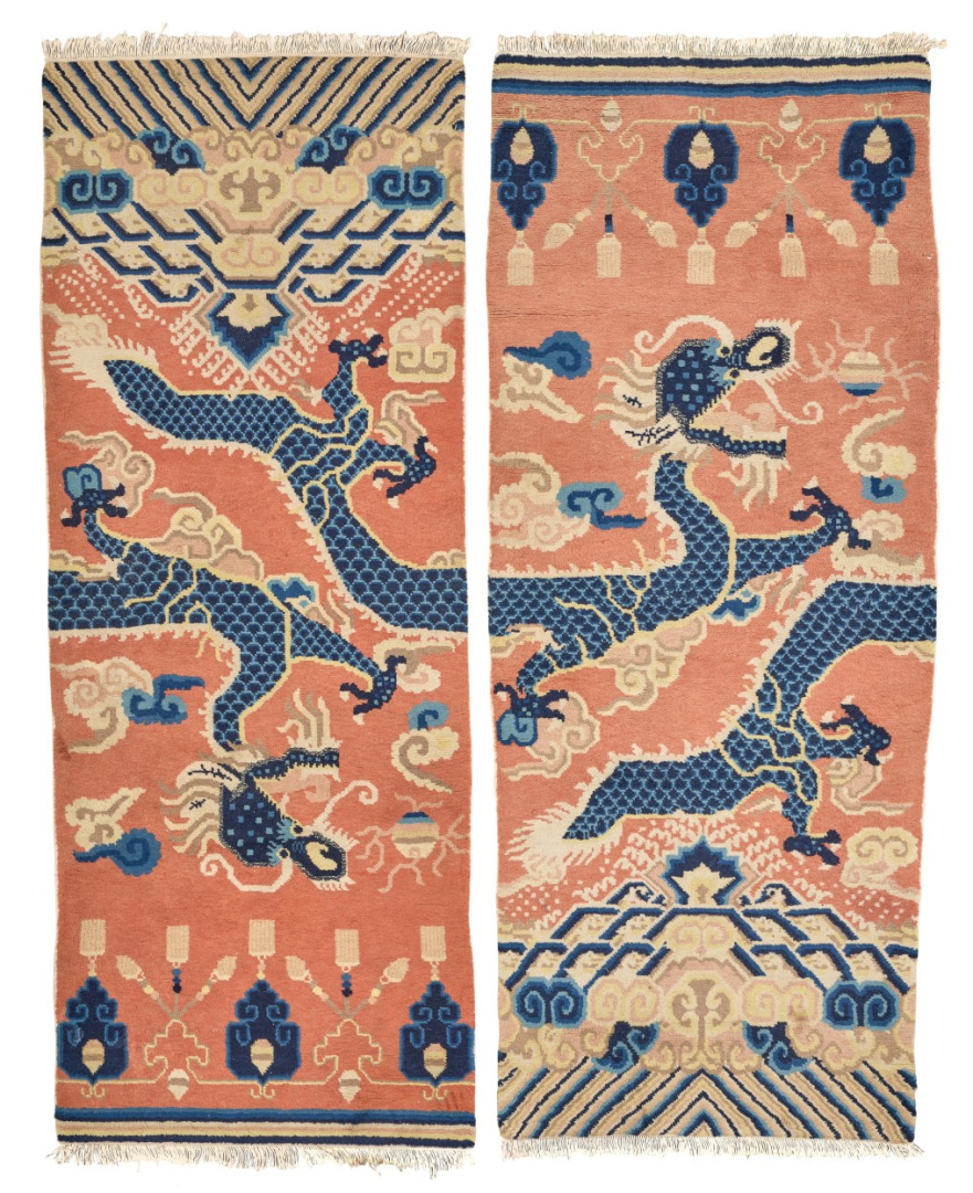 The dragon motif is the most common, and, as in this example, these fabrics have no lateral borders, so that the dragons' bodies can form a single decorative motif across multiple rugs.